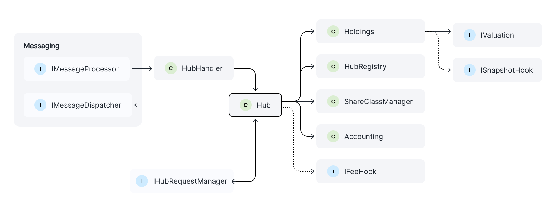 The Hub coordinates with ShareClassManager, Holdings, Accounting, and HubRegistry to maintain consistent pool state. It supports batched multicall operations for efficient transaction execution and integrates with an optional fee hook for custom fee logic. All cross-chain communication flows through the Hub's integration with the Gateway's message sender, enabling pools to notify remote chains of share class updates, price changes, and other critical state transitions.